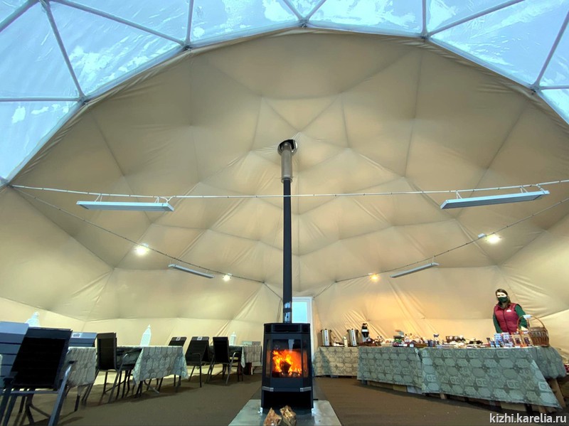 На самом острове, в основной экспозиции, также оборудовано специальное место — эффектная сфера с камином внутри, где гости могут погреться, подкрепиться и купить что-нибудь на память об острове.