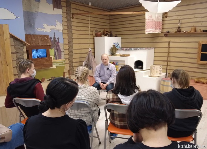 Будущие фольклористы из Карельского колледжа культуры и искусств услышали образец пения старины (былины) про Илью и Змея, узнали народные сказки не для детей из уст сотрудника музея «Кижи», хранителя сказительской традиции Заонежья, Олега Скобелева.