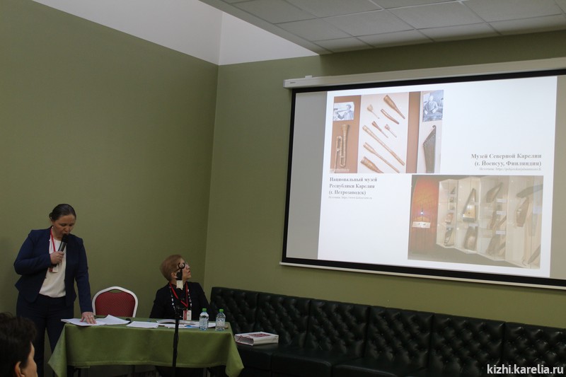 Начальник отдел фольклора и руководитель Фольклорного ансамбля музея Наталья Михайлова представила коллегам опыт выявления и систематизации музыкальных инструментов Карелии в музейных собраниях России и Финляндии. Научный сотрудник Дарья Абросимова выступила с основанным на собственных полевых исследованиях докладом о праздничной традиции Лекшмозерья.