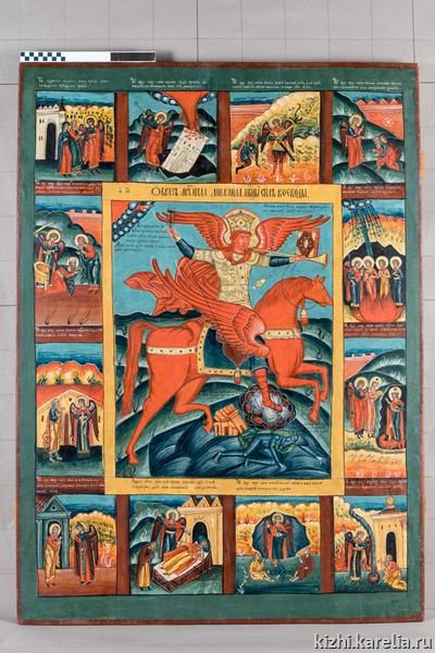 Наконец-то этим летом после сложной реставрации икона с изображением Архангела Михаила из фондов музея «Кижи» стала доступной для обозрения. Теперь ее можно увидеть на выставке древнерусской живописи в трапезной Покровской церкви на острове Кижи. Икона яркая, не заметить её сложно. Это типичный образец местного северного письма второй половины XVIII в.