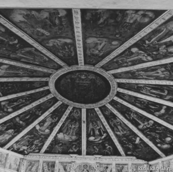 На черно-белых фотографиях финского исследователя Ларса Петтерссона запечатлены лики и сюжеты кижских небес. В архивах Финляндии сохранилось текстовое описание цветов потолочной живописи, в том числе заметки Л. Петтерссона о темном сине-зелёном цвете фона «неба» и лососёво-красном оттенке мандорлы центрального медальона «Новозаветная Троица».