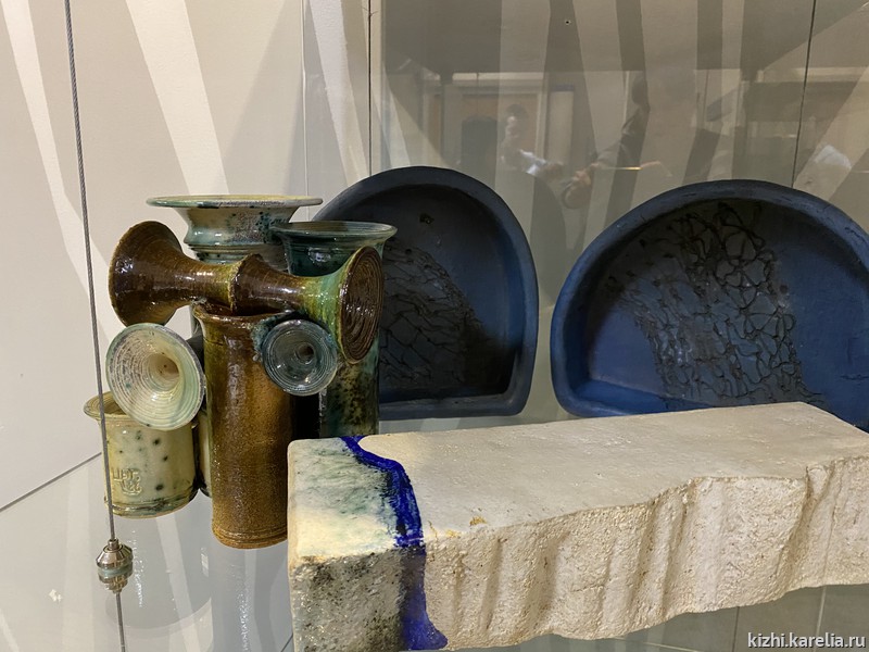 Например, сразу на входе в выставочное пространство посетителя встречает композиция Людмилы Шушкановой. На первый взгляд это несколько сине-зеленых ваз разного размера с нанесенным на них рисунком непонятного характера. Но если выставить вазы в определенном порядке, то зрителю предстанет фигура динозавра. Работа называется «Последний динозавр». От избирательного внимания человека к окружающим объектам и строится его восприятие картины мира.