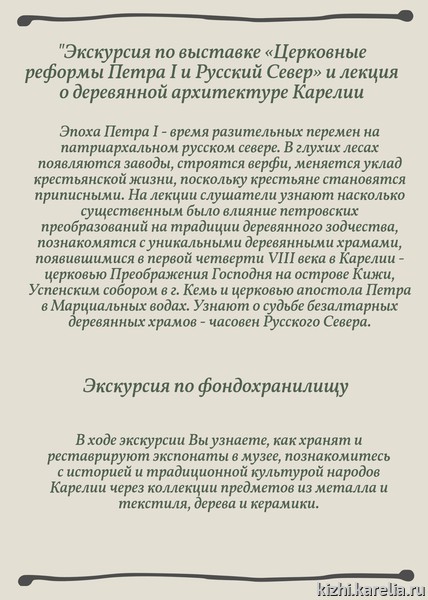 - Посещение выставки «Церковные реформы Петра I и Русский Север» и лекцию о деревянной архитектуре Карелии