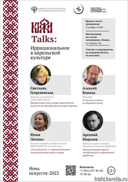 В Ночь искусств, 3 ноября, выставочный зал музея «Кижи» начинает серию коротких лекций «KIZHI TALKS». Первая тема встречи: иррациональное в карельской культуре.