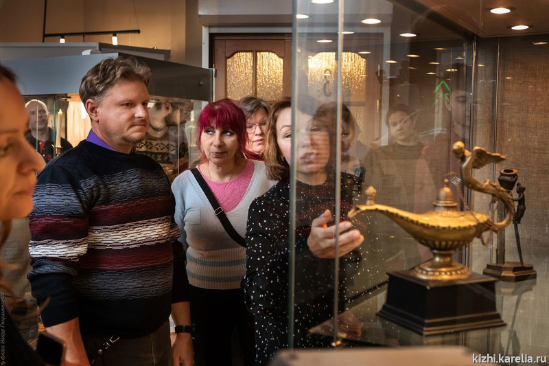Первых посетителей в выставочном зале музея «Кижи» встретила интригующая темнота, а потом чудесным образом вспыхнули огни 80 осветительных приборов: настольных ламп, уличных фонарей, причудливых ночников, архитектурных подсветок, елочных гирлянд — экспонатов, освещающих путь в историю светотехники.