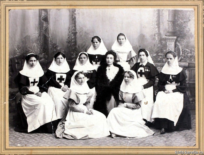 На фотографии — Анна Васильевна Протасьева, жена Олонецкого губернатора, среди учащихся и сестёр милосердия петрозаводской Свято-Петровской общины сестёр милосердия.