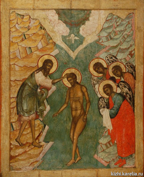 Сравнивая иконографические особенности разных крещенских икон, можно заметить, что икона из кижской Покровской церкви отличается крайним лаконизмом: минимальное количество персонажей, почти полное отсутствие поясняющих деталей, в том числе, в изображении небесной сферы. Можно лишь отметить неожиданное различие цвета горок на разных берегах: охристые под ногами Иоанна Предтечи, они становятся голубоватыми под ногами ангелов.