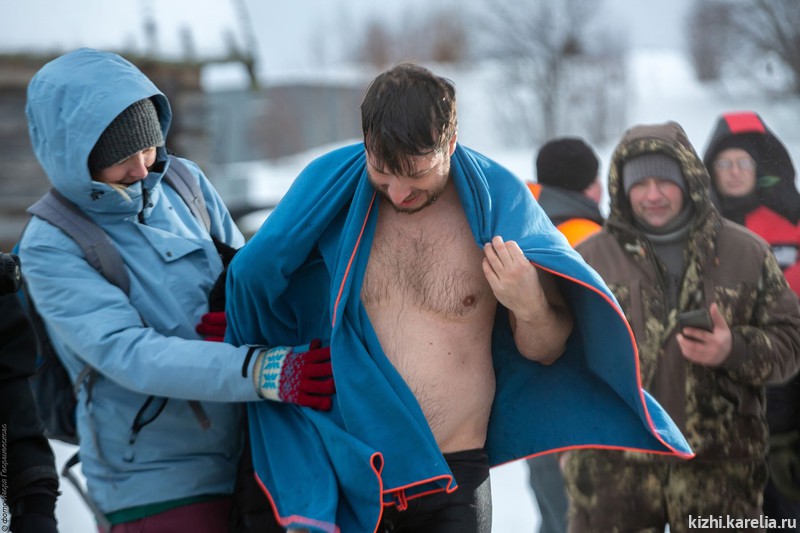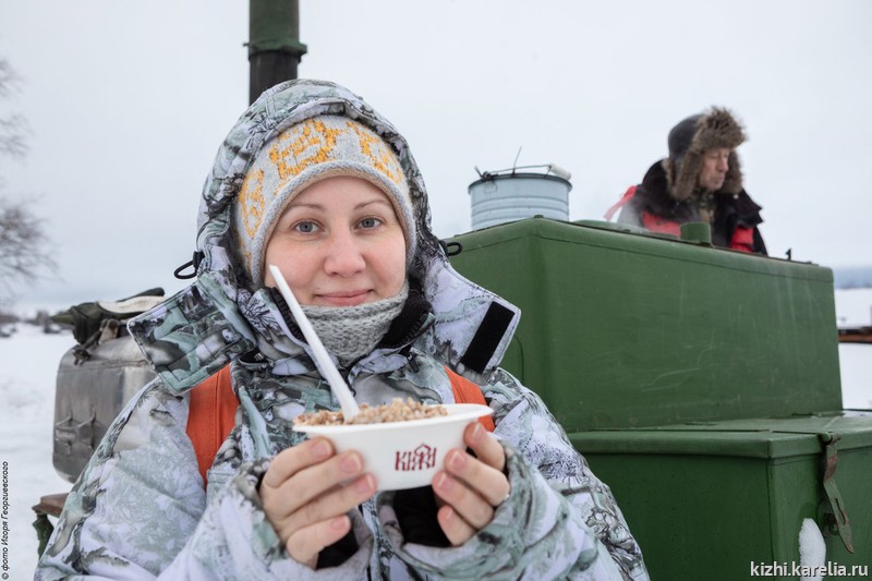 Затем можно было набрать святой воды, после чего желающие окунулись в крещенскую прорубь, разумеется, под присмотром спасателей. На берегу гостей ждало традиционное кижское угощение: вкуснейшая гречневая каша с тушенкой из полевой кухни и ароматный чай из настоящего самовара.