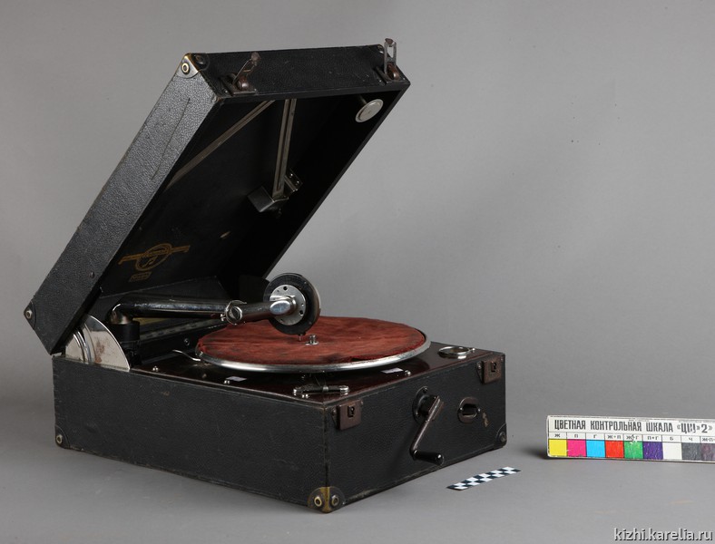 Патефон из фондов музея «Кижи» в рабочем состоянии, воспроизводит запись на патефонной пластинке со скоростью 78 оборотов в минуту с возможностью замедления и ускорения.