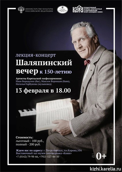 Сегодня в выставочном зале музея «Кижи» состоится необычная акция к 150-летию со дня рождения Федора Шаляпина – в течение всего дня посетители могут приходить в зал и слушать записи подлинного голоса оперного певца! Во времена Шаляпина его арии слушали на патефоне, поэтому в зале вы увидите патефон фирмы Columbia Graphophone Company Ltd (1928–1932 гг., Лондон)