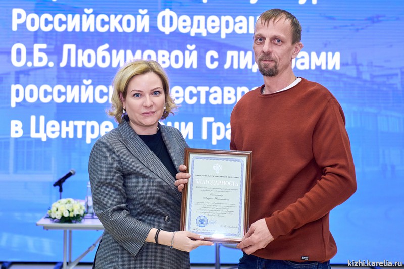 На встрече были вручены награды выдающимся работникам отрасли. В том числе, благодарности Министра культуры были вручены старшему мастеру реставрационного отдела «Плотницкий центр» музея-заповедника «Кижи» Андрею Степанову и его коллеге ведущему специалисту по обеспечению сохранности объектов культурного наследия Александру Трегубову.