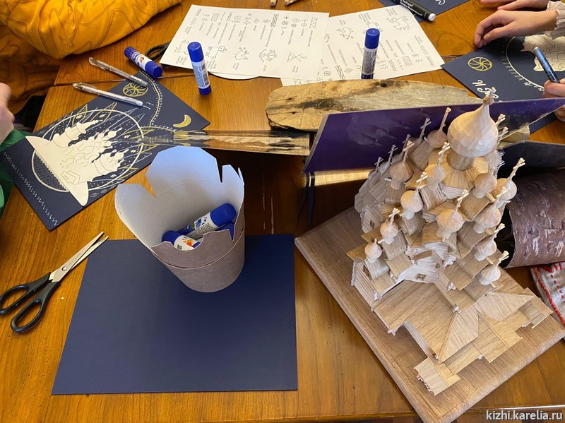 Во время мастер-класса мы предлагаем участникам своими руками создать композицию, центром которой станут силуэты кижских церквей в окруженни орнамента из традиционных символов.