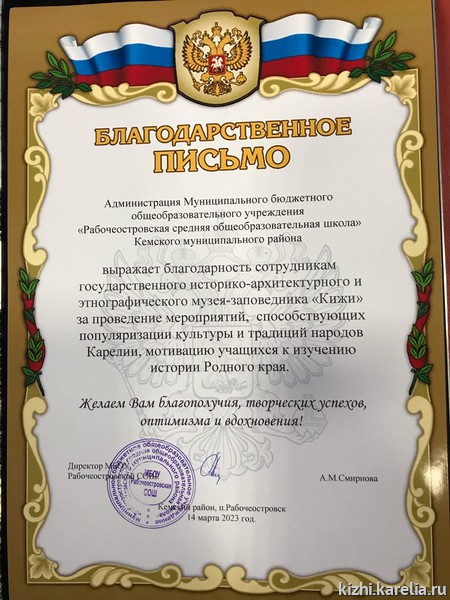 Участники проекта выражают благодарность за помощь в организации встреч и радушный прием Марине Пауш, заместителю начальника Управления образования Кемского района, Ирине Устин, директору Кемского музея «Поморье», участницам фольклорного ансамбля «Поморяночки», администрации и учителям школ Кеми и поселка Рабочеостровск.