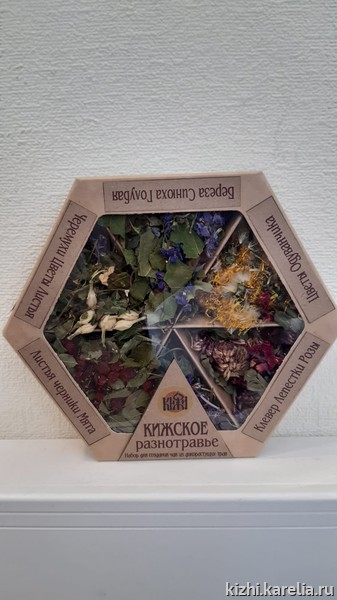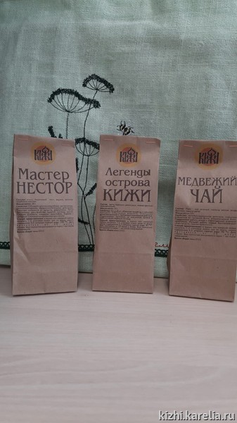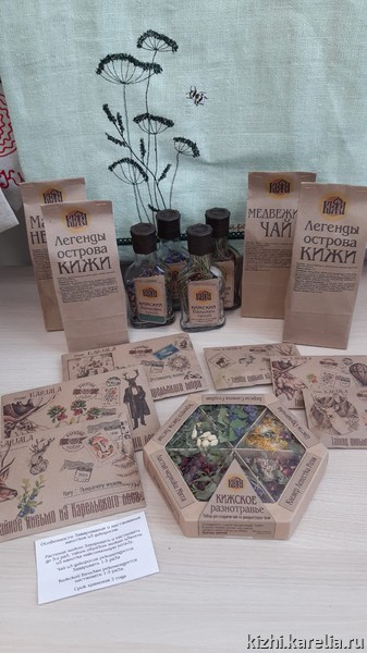 «Мастер Нестор», «Легенды острова Кижи», «Медвежий чай» — чаи из карельских дикоросов на прилавке сувенирного магазина музея «Кижи»