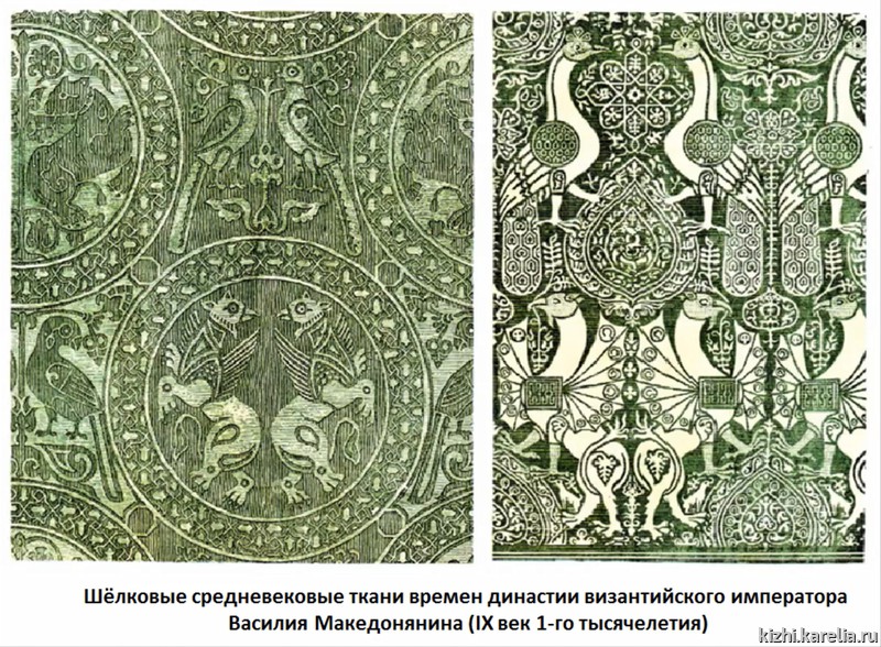 На византийских материях, кроме мелких узоров, преимущественно были узоры в больших кругах, в которых чаще всего изображались животные (часто фантастические), например, грифы. Узоры вырабатывались не только с помощью ткацких переплетений, но и с помощью набойки. На образцах тканей из славянских курганов Х — ХIII веков прослеживались печатные узоры из кругов с розетками или крестиками в них, выполненные с помощь. специальных штампиков. Узоры с круглящимися линиями легче выполнимы и поэтому получили наибольшее распространение.
