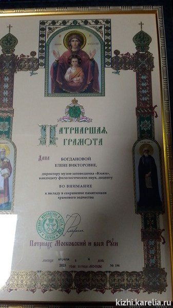 Директор музея-заповедника «Кижи» Елена Богданова получила грамоту патриарха Московского и всея Руси Кирилла: «Во внимание к вкладу в сохранение памятников храмового зодчества».