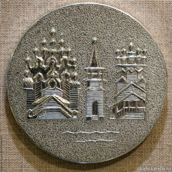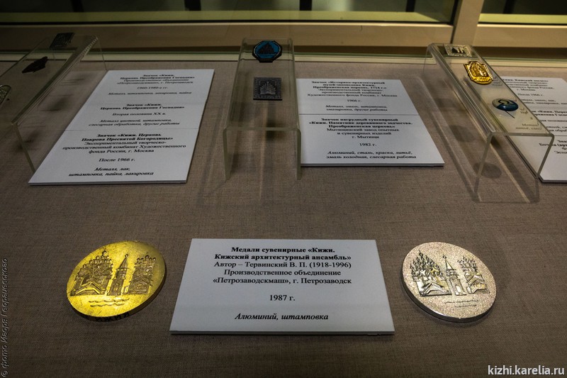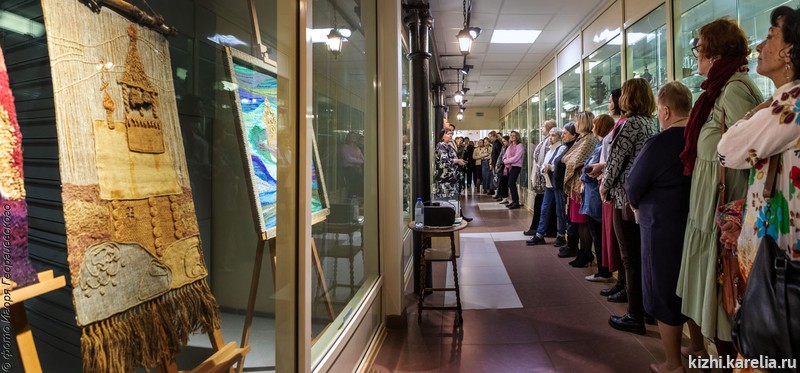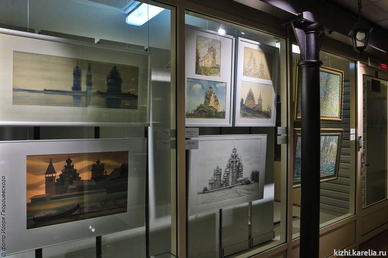 Здесь представлены 55 работ, в том числе и фантазийные сказочные образы кижских церквей, гравюры, текстильные работы, гобелены, значки, конверты и открытки с изображениями Кижей.