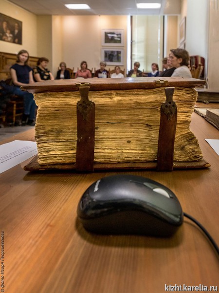 Главный архивист Национального архива Республики Карелия Мария Неёлова познакомила собравшихся с уникальной коллекцией древних рукописных и старопечатных книг XV — XIX вв., девять из которых включены в Реестр уникальных документов архивного фонда Российской Федерации.