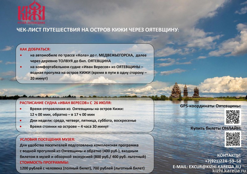 Мы подготовили актуальную информацию для планирования поездки на остров Кижи через деревню Оятевщина Медвежьегорского района.