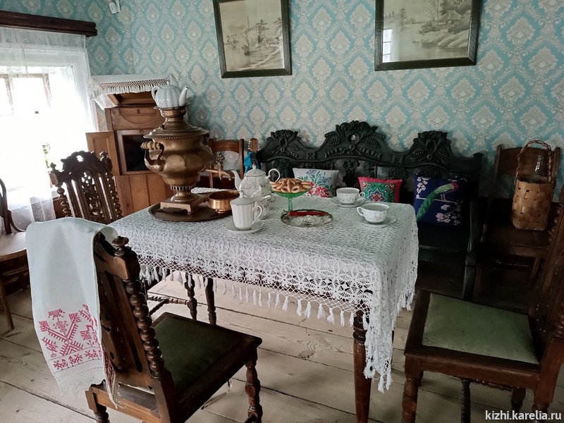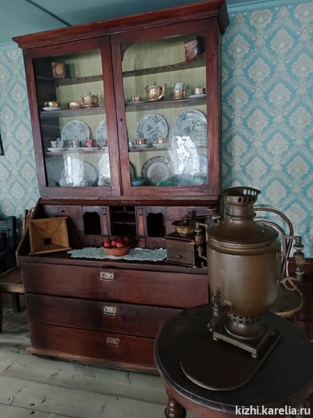 В буфете за стеклянными дверцами можно увидеть предметы из фарфоровых чайных сервизов конца ХIX — середины XX века из коллекции музея «Кижи», изготовленные на заводе М. С. Кузнецова. Здесь же посетители рассмотрят модные чайные атрибуты эпохи — чайные пары, украшенные росписью, позолотой, рельефными деталями, фарфоровые, фаянсовые и стеклянные предметы праздничного стола: чайницы, полоскательницы, блюда, тарелки, фигурные сахарницы и вазы.