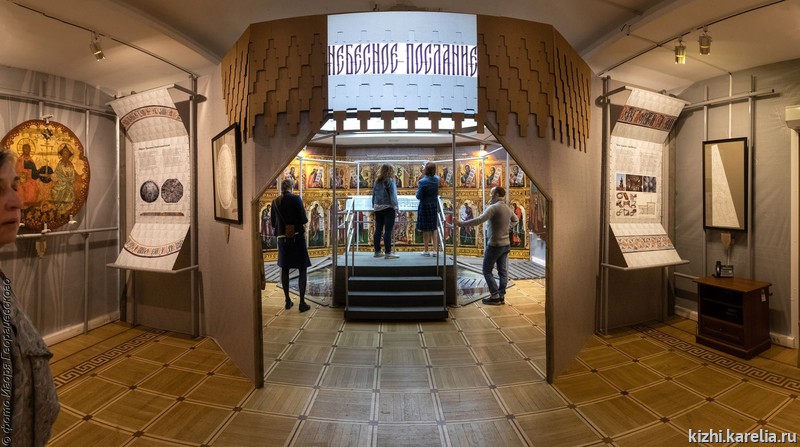 На выставке вы увидите подлинные иконы «неба» и детали «небес» из фондов музея «Кижи», реконструкции огромных клиновидных потолочных икон Преображенской церкви в натуральную величину, реконструкцию «небес» на основании сохранившихся фотографий.