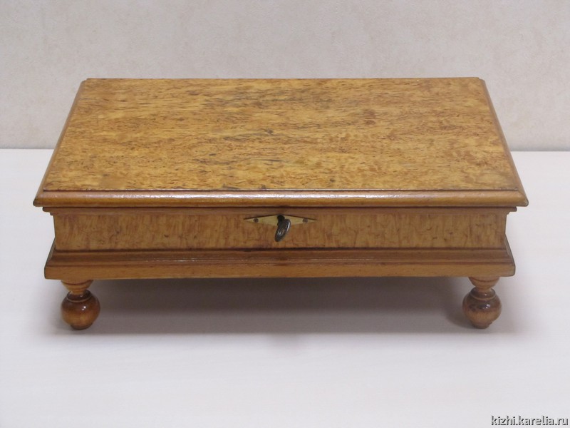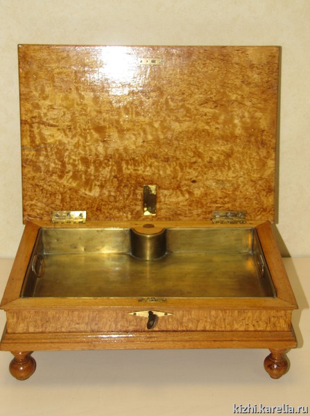 Шкатулка непростая. Изготовлена из нескольких пород деревьев — дуба и бука, облицована шпоном карельской березы. Внешне представляет собой столик с подстольем на коротких фигурных ножках в форме дынек. Внутри — съемная металлическая латунная емкость с ручками. Крышка откидная, сплошная, на двух латунных петлях, соединена с корпусом ящика внутренним замочком.