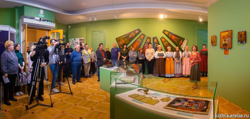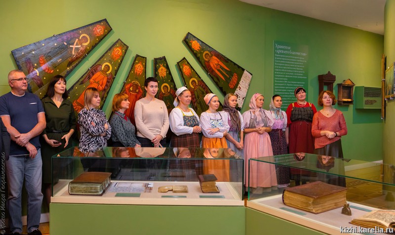 Особую атмосферу на открытии выставки создал Фольклорный ансамбль музея «Кижи». Своим исполнением старинных духовных стихов «Сон Богородицы» и «Страшный суд» артисты заворожили посетителей, вдохнули жизнь в новую экспозицию икон, фолиантов, фотографий, принадлежностей для иконописи.