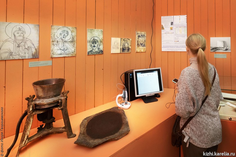 В потаенной комнате посетители увидят не только раритеты – краскотерку, ступу, плиту для растирания красок, – но и современный электронный микроскоп, который позволяет рассмотреть на экране монитора состав краски.