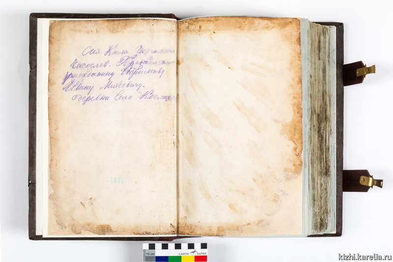 Церковная книга с текстами молитв для ежедневных служб в храмах поступила в фонды музея «Кижи» в 1984 году. На форзаце часослова имеется запись химическим карандашом о принадлежности книги Ивану Михеевичу Абрамову из деревни Космозеро: «Сия книга глаголемая Часослов. Принадлежит гражданину Абрамову Ивану Михеевичу деревни Село Космозеро».