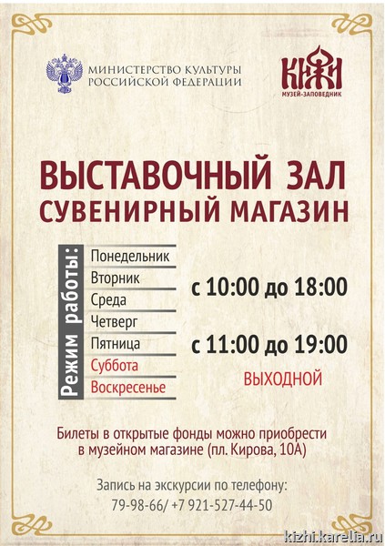Обращаем ваше внимание на изменение графика работы выставочного зала музея «Кижи» в Петрозаводске на пл. Кирова, 10 а с 4 декабря. С понедельника по четверг зал открыт с 10.00 до 18.00; в пятницу — с 11.00 до 19.00; суббота и воскресенье — выходные.