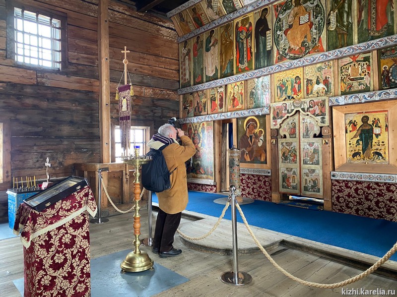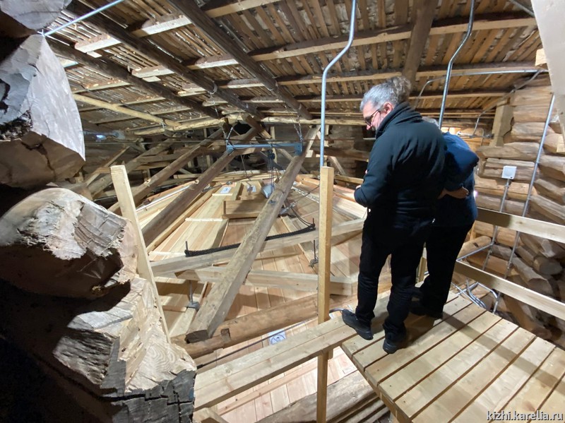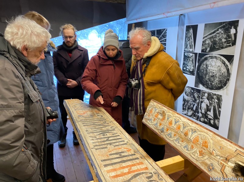 Кроме того, миссия посетила Пудожский сектор музея, где хранятся подлинные тябла иконостаса и неба Преображенской церкви, а также потолочные иконы из других храмов. Тябла иконостаса были скрыты за более поздним рамным резным иконостасом, а тябла неба — демонтированы во время сборки металлокаркаса внутри Преображенской церкви в начале 1980-х годов, когда здание признали аварийным. В хранилище икон говорили о различных вариантах восстановления потолочных икон «неба» церкви Преображения.