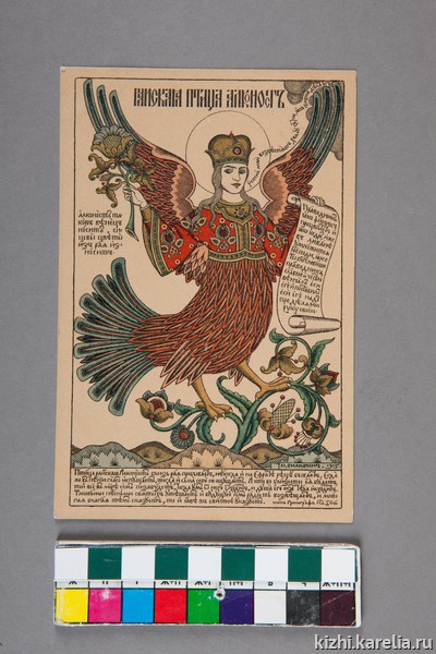 - Печатные тексты: «РАИСКАѨ ПТИЦА АЛКОНОСТЪ» (в центре верх. поля, вязью), «И. Билибинъ. 1905. «(в нижней части изображения, справа), „устне мои возвѣстѧтъ хвалу Г[оспо]дню, ѧко дивна дѣла его“, „Алконость та-/ковъ вѣнецъ / носитъ, си-/цевы цвѣты / изъ раѧ из-/носить“ (на изображении). Под изображением печатный текст в 5 строк, нач.: „Птица райскаѧ Алконостъ близъ раѧ пребываетъ…“. На оборотной стороне (печать зелёным цветом): логотип Общины св. Евгении.