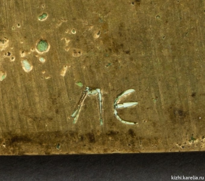 При детальном исследовании этой иконы на оборотной стороне было обнаружено клеймо: «ЛЕ». Буквы у клейма составные, прочеканены тремя пуансонами: длинной чертой — вертикальные и наклонные части букв; короткой чертой — горизонтальные элементы букв и половиной окружности — часть буквы «Е».