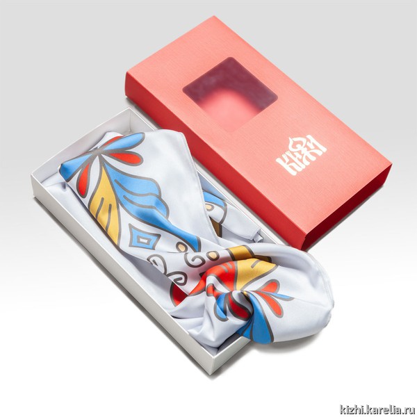 Платок упакован в подарочную коробку из крафтового картона с логотипом музея-заповедника «Кижи».