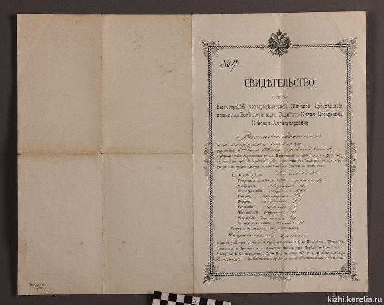Фондовый предмет — в интернет: свидетельство Вытегорской четырехклассной Женской Прогимназии