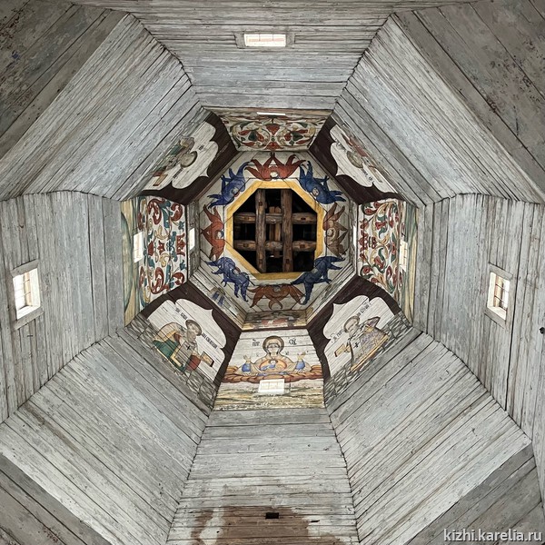 «Памятник, безусловно, интересен тем,— отметила главный хранитель музея „Кижи“ Анастасия Диброва,— что „небо“ Старо-Вознесенской церкви состоит из одной центральной восьмиугольной иконы, без икон-граней. У музея „Кижи“ накоплен большой опыт в изучении потолочной живописи деревянных православных храмов. Наш реставратор осматривает икону».