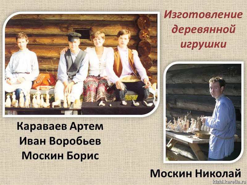 - Обработка дерева — изготовление деревянной игрушки, объемная резьба по дереву (Д. Москин, И. Набоков, Н. Москин, Б. Москин, И. Воробьёв, А. Караваев);