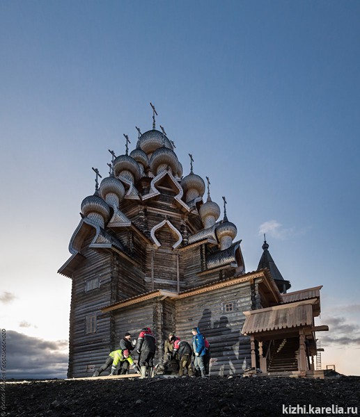 Заонежье славилось мастерами по обработке дерева. Потомственные плотники сохранившие древние приемы ремесла, стали ядром первых реставрационных бригад, работавших на церкви Преображения в 50-е годы XX века. Это были люди, прошедшие войну и продолжившие дело своих предков, построивших храмы Кижского погоста.