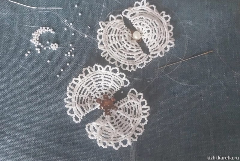 Когда первая пара основ была готова, к работе над серьгами приступила Надежда Панькова. Изучив различные способы оплетения основ, «разобрав» образцы с фотографий на схемы, подобрав материал, мастерица принялась за работу. Оказалось, что конский волос из фондовых образцов подвержен быстрому разрушению, поэтому было принято решение заменить его леской. Она не столь упруга, как конский волос, и доставила немало хлопот, но результат был достоин трудов — мелкие бисеринки выстраивались ряд за рядом ажурными петельками.