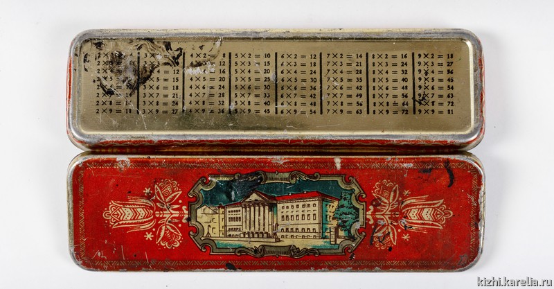 На внешней стороне крышки на красном фоне, в картуше, изображён городской пейзаж с четырёхэтажным зданием с портиком и красной кровлей. Справа и слева от картуша – растительно-цветочный орнамент. По периметру крышки – декоративная рамка. На крышке сзади, возле петли, надпись в одну строку: «ММС[Х]П ЭССР ЖЕСТ. ЛИТ. «НОРМА» г. ТАЛЛИН.». На основании, на золотом фоне чёрным шрифтом нанесена таблица умножения.