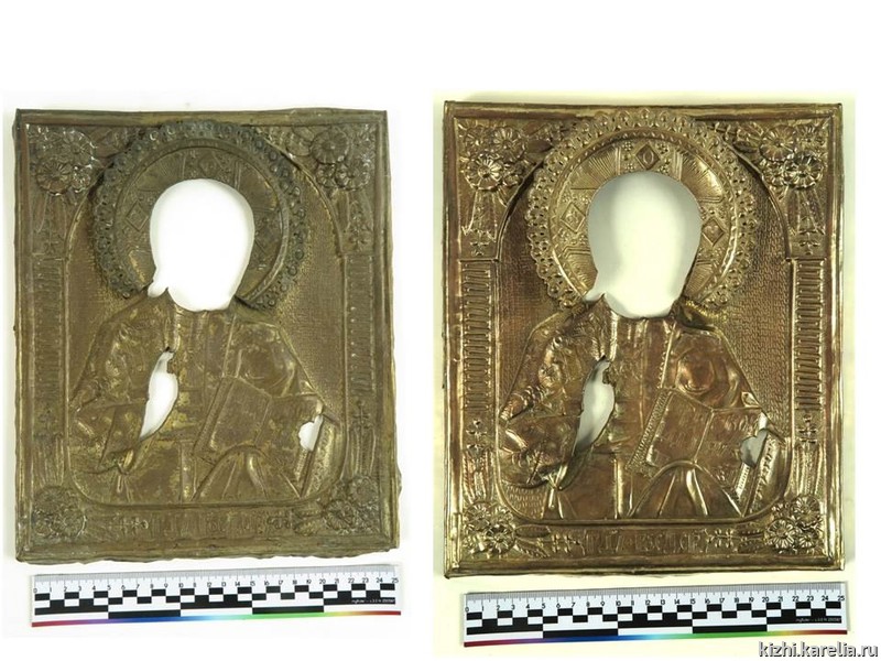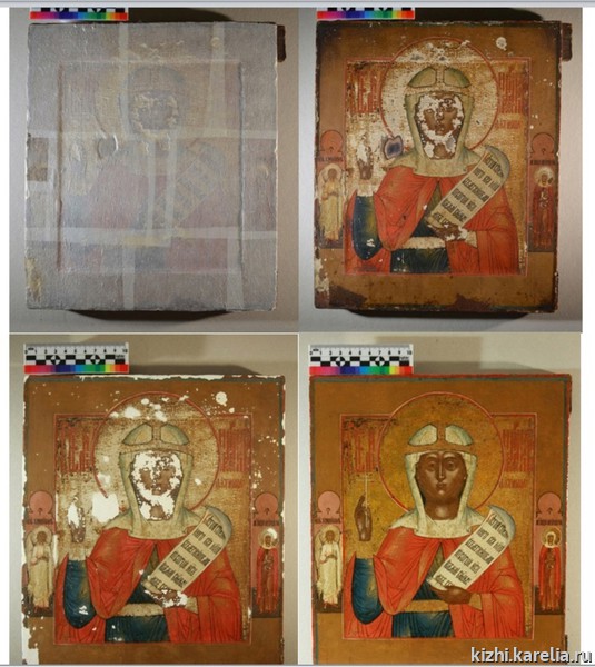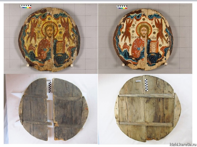 На фото «до и после» можно видеть очевидный результат, а сколько проводится точечных работ, сколько труда вложено в подготовку! На первой фотографии – икона-медальон «Вседержитель» XVIII века из часовни заонежской деревни Корба. Это комплексная работа дуэта реставраторов – Надежды Куусела и Михаила Фролова. Михаил как специалист по реставрации дерева восстановил целостность иконного щита, укрепил деревянную основу. Надежда как реставратор темперной живописи вернула иконе первоначальную яркость красок и защитила красочный слой от дальнейших разрушений.