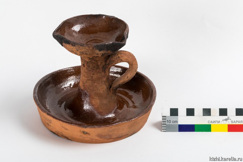 В качестве источника света в крестьянском (помимо лучины), городском быту, чаще использовались лампады и металлические подсвечники, которые прочней глиняных. Ручной лепки подсвечник состоит из поддона в виде блюдца с высоким бортом и подставки под свечу в виде чаши на массивной цилиндрической ножке, плавно переходящей в поддон. Ножка дополнена С-образной ручкой. Чаша подставки округлой формы, с тремя открытыми носиками для сливания воска. Поверхность коричневого цвета, частично покрыта глазурью: поддон и чаша — внутри, ножка — у основания. Основание в центральной части заглублено.