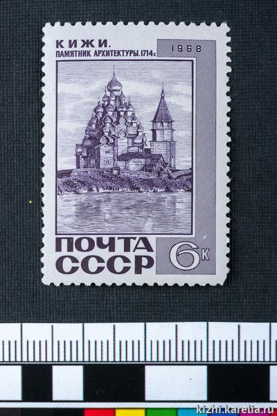 Первая почтовая марка с изображением Кижского архитектурного ансамбля вышла в 1968 году в серии «Памятники архитектуры СССР». Интересно, что из шести выбранных для серии объектов, два – памятники деревянного зодчества с острова Кижи.