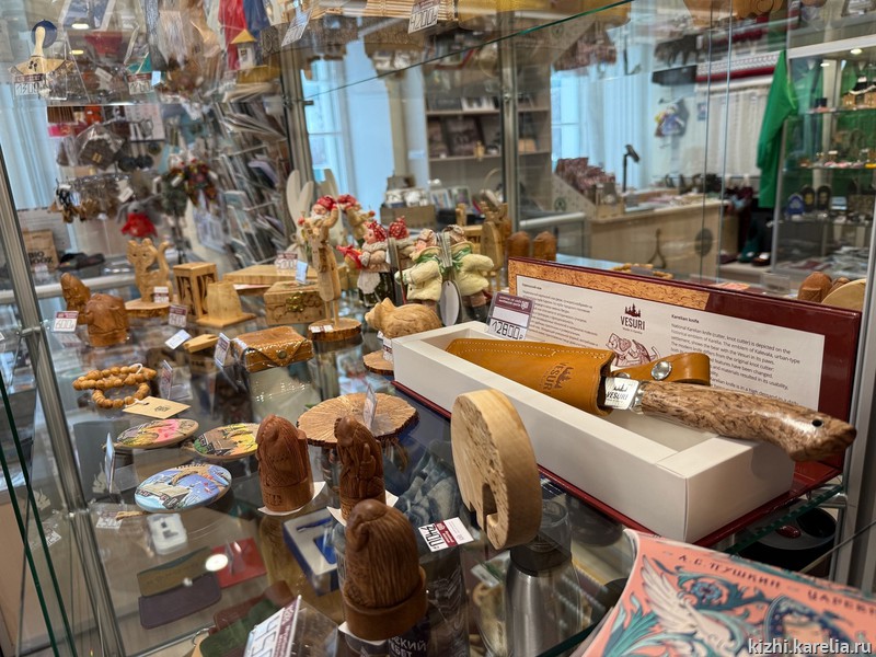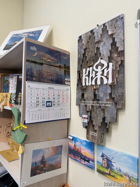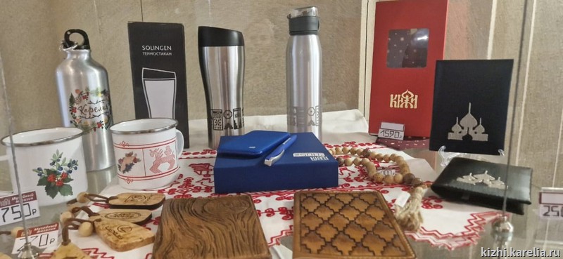 В наличие мужские наборы для бани в удобной сумке, а также различные кружки и брелоки с кижской символикой, и, конечно, календари.