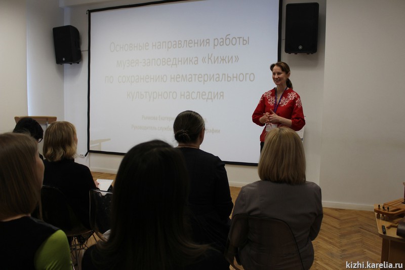 Руководитель службы истории и этнографии Екатерина Рычкова представила творчество кижских мастеров, которые сохраняют уникальные технологии женских и мужских ремесел. Концертмейстер Евгений Михайлов исполнил традиционные наигрыши на кантеле. Говорили об искусстве колокольных звонов, гастрономических программах, шитье лодок, о необходимости иммерсивного погружения в историческую тематику для знакомства с особенностями культуры и быта края и региона. Ведь именно такое погружение и способствует сохранению нематериального культурного наследия.