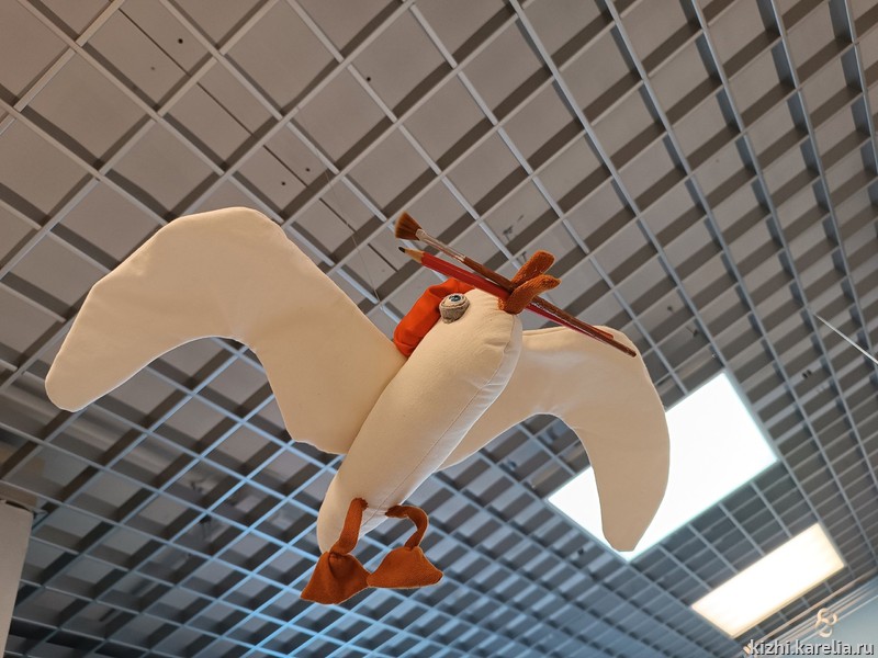 Под парусом полным ходом отправился в путь арт-корабль, вокруг него парят чайки, держа в клювах карандаши и кисточки, на горизонте — заповедный остров, на палубе — шумная команда, ростом до 150 см, в тельняшках, на капитанском мостике — художник Светлана Петрякова, идейный вдохновитель и автор выставки, посвященной 20-летию студии «Кижская палитра».