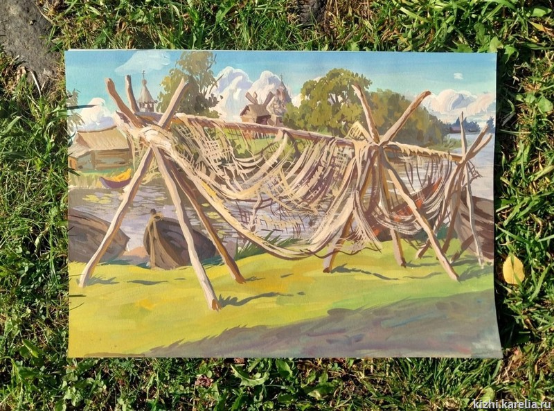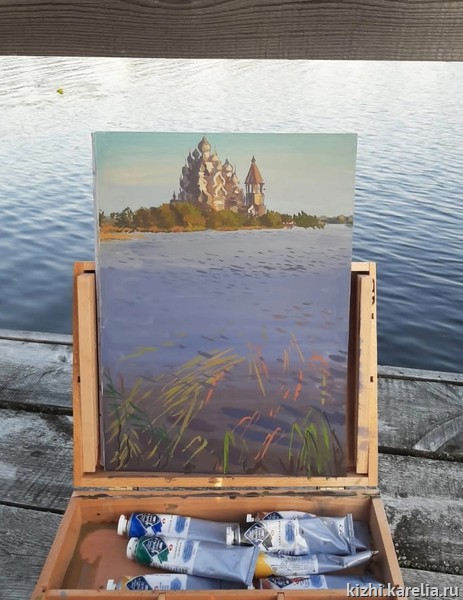 «На острове я был несколько раз, так как работаю летом на теплоходе, и мы часто останавливались с туристами в Кижах. После этих поездок сложилась серия работ, собирательный образ деревянной архитектуры острова. Хотелось передать преемственность поколений и общее стремление людей прошлого к чему-то духовному. На острове меня удивило ощущение, что он будто парит с облаками, как в сказке. И сама архитектура как из сказок» — рассказал мастер.