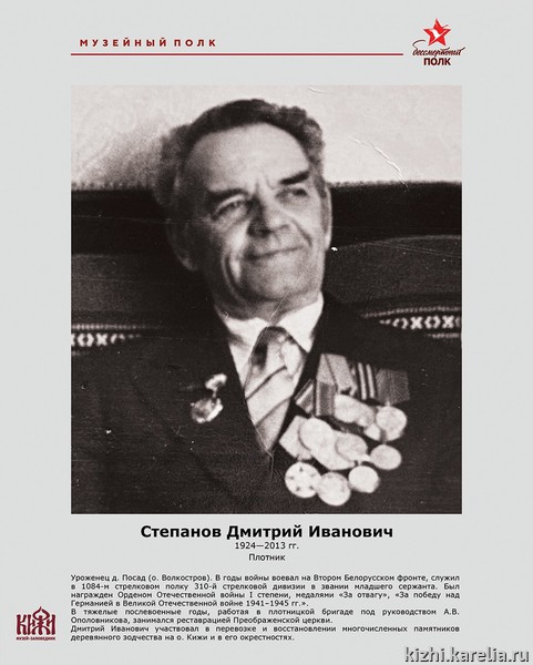 Рубрику «Кижский музейный полк», посвященную сотрудникам музея «Кижи», прошедшим Великую Отечественную войну, продолжает плотник-реставратор Дмитрий Иванович Степанов (1924–2013).