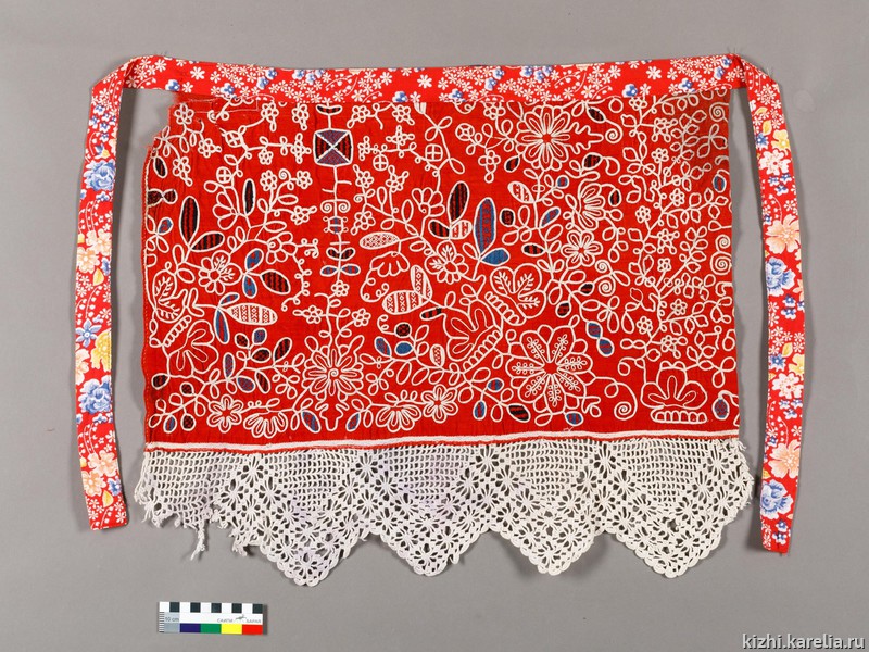Несмотря на небольшой размер (48×58 см), этот передник, изготовленный предположительно в Пудожском районе Карелии в начале прошлого века,— весьма сложное изделие. Кумач заполнен белой машинной «тамбурной» вышивкой с цветной инкрустацией выполненными вручную швами «гладь», «крест», «набор», «досюльный». По низу — белое кружево, вязанное крючком.