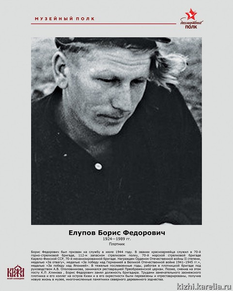 Рубрику «Кижский музейный полк», посвященную сотрудникам музея «Кижи», воевавшим на фронтах Великой Отечественной войны, продолжает плотник-реставратор Борис Федорович Елупов (1924–1989).